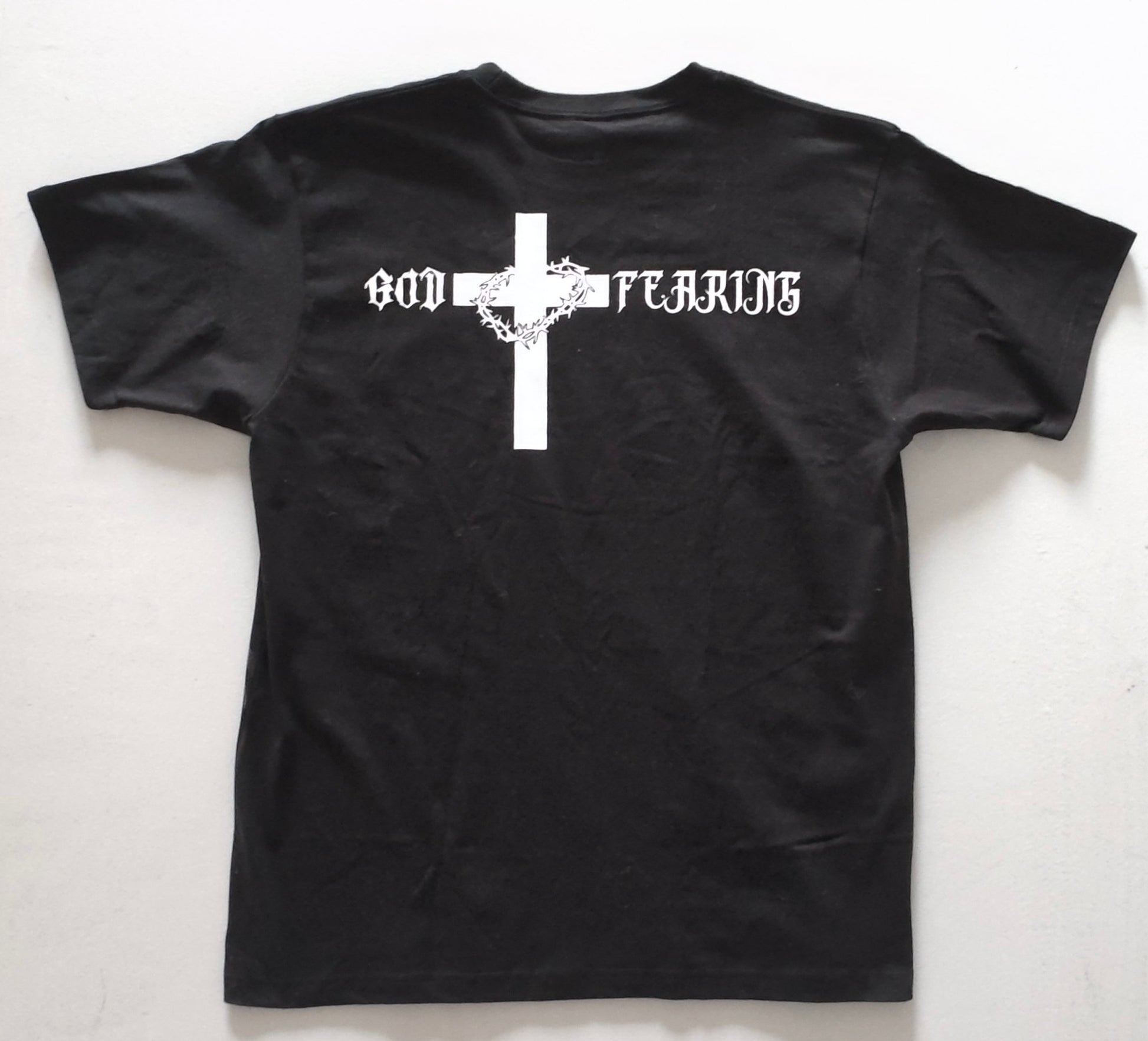 oversized black tee with Puff Print letters that says "GOD FEARING" with a cross in the middle